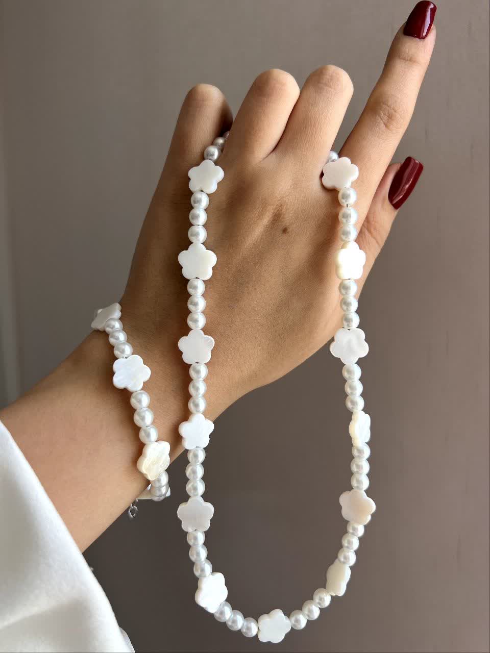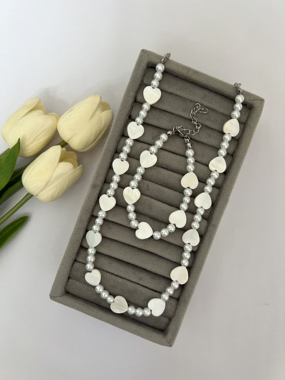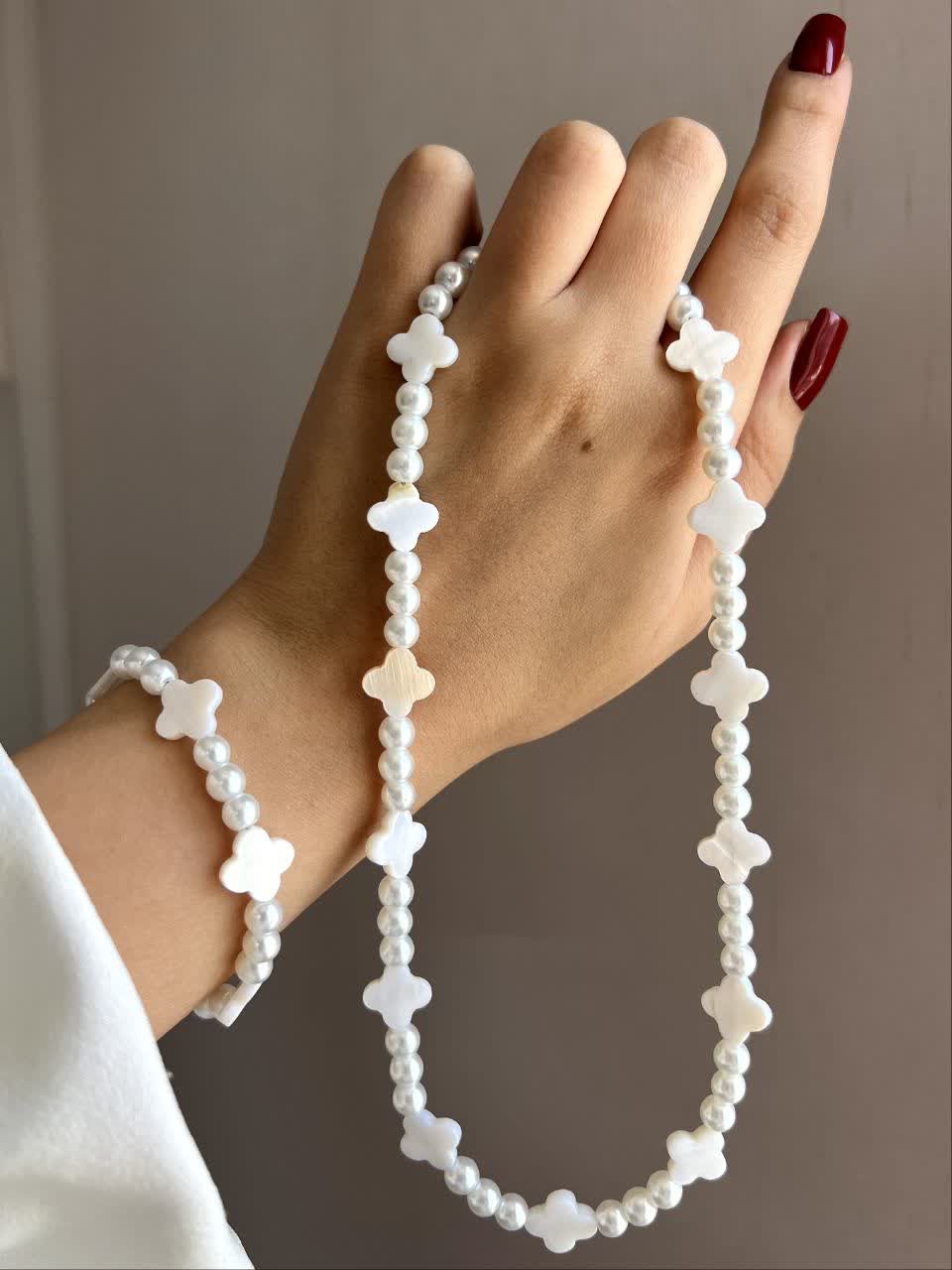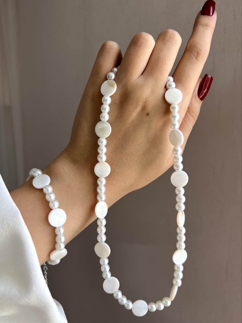 گردنبند و دستبند پینترستی مرواریدی و صدف شکل دار که مناسب استایل های کیوت و دخترونه هست