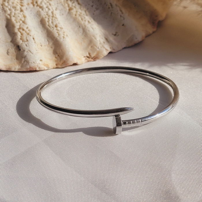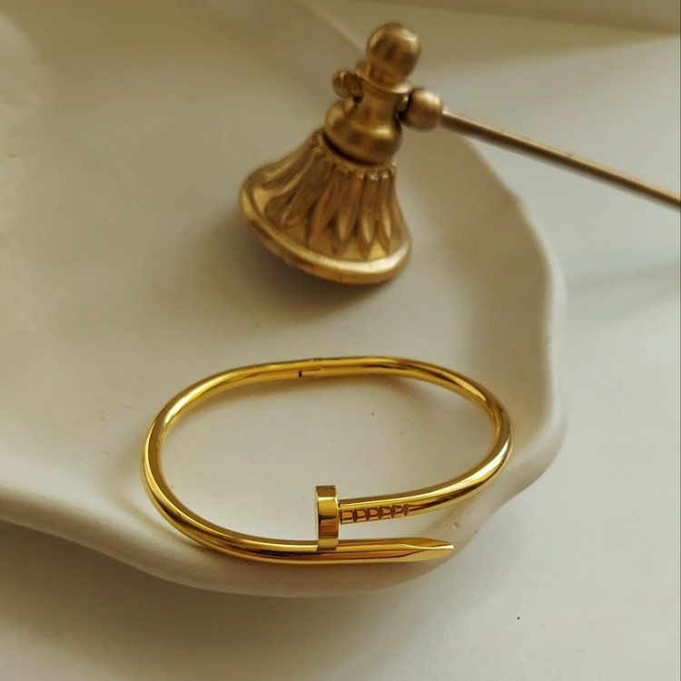 بنگل میخ کارتیر اسپرت در دو رنگ طلایی و نقرهای عرضه میشود. این دستبند از وسط میخ باز میشود و به راحتی قابل استفاده است. جنس استیل با رنگ ثابت تضمینی، مناسب دور مچ ۱۶ تا ۱۸.۵ سانت، اسپرت و شیک، برای خانمها و آقایان.